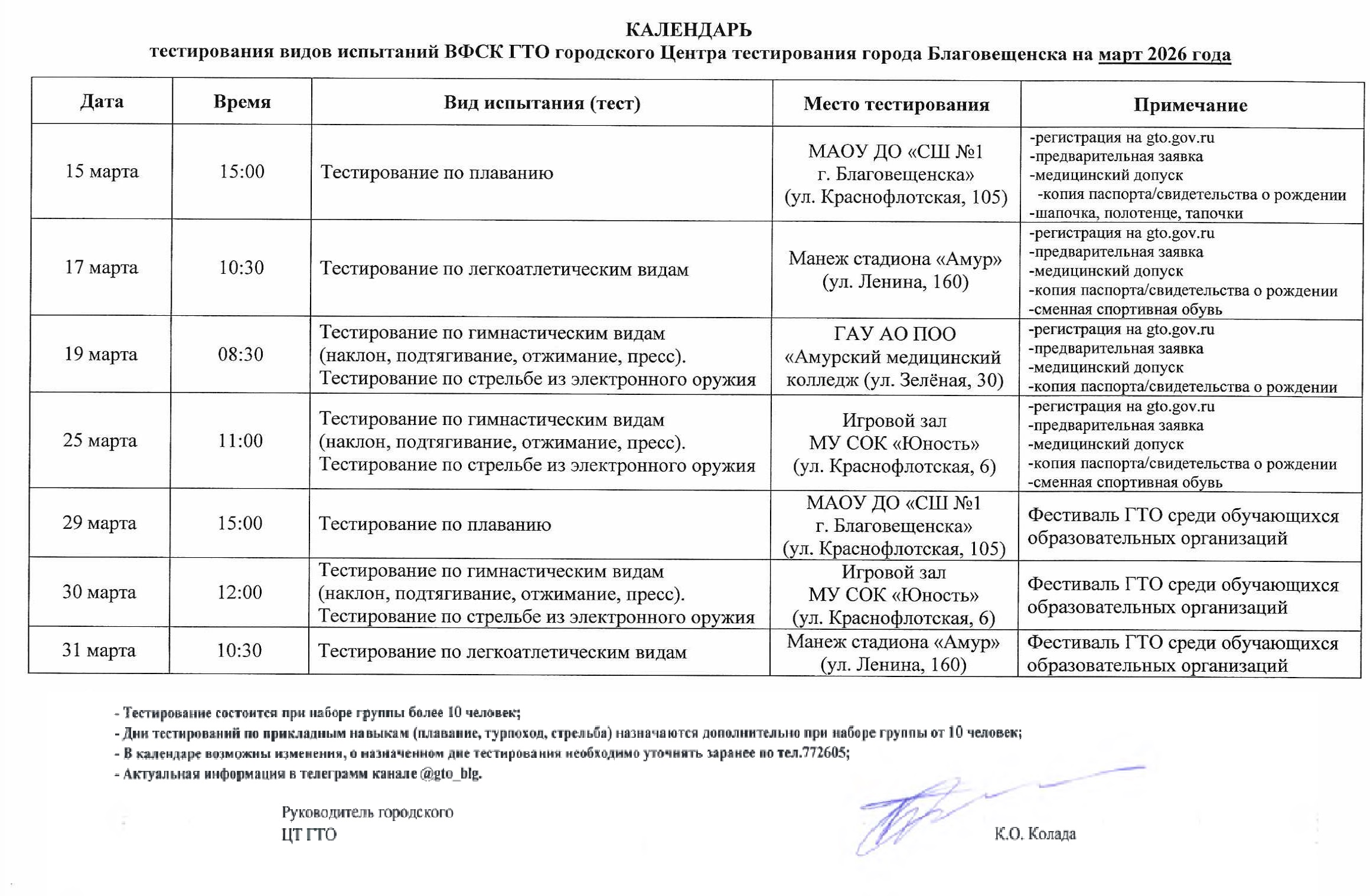 | Руководитель городского Центра тестирования ГТО | Колада Константин Олегович | 772605 |
